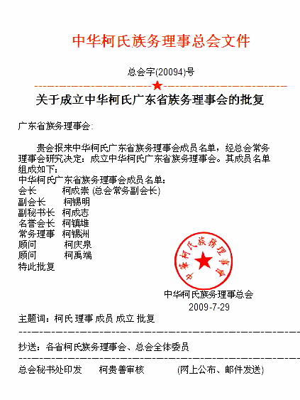 贵会报来中华柯氏广东省族务理事会成员名单,经总会常务理事会研究决定:成立中华柯氏广东省族务理事会。其成员名单组成如下:
